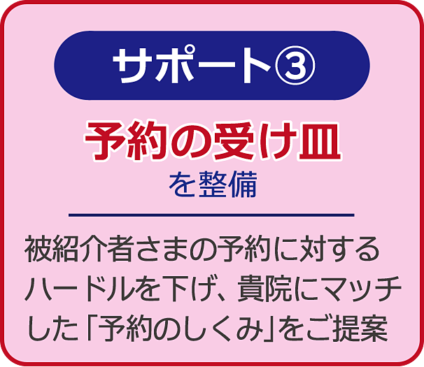 また、現在の予約の方法や、貴院にあった紹介特典の設定についてもご相談させていただきます。